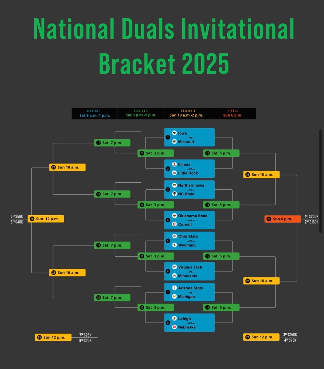 The full bracket and consolation structure/payouts is visible on https://nationaldualsinvitational.com/. I'd post it, but it's big and I'm not particularly savvy with that kind of thing. -