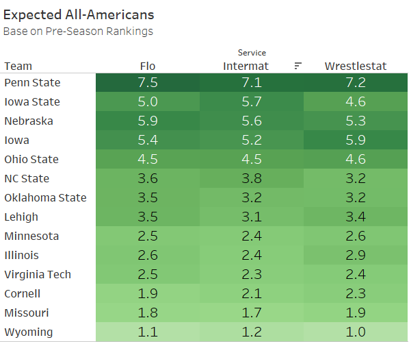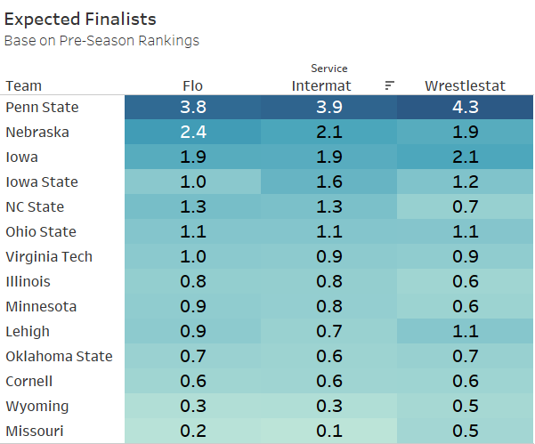 Let's Do a little something different this year. With all three services reporting their pre-season rankings I thought I would take a look at expectations. Saturday Night's Alright For Fighting Get a little action in. Let's start with expected finalists. The three services see lineups and weights a bit different at this early stage, but who cares. Let's make some reckless predictions. These are all the teams that have at least a 50/50 shot at one finalist in at least one service. Everyone's All-American Sticking with the same roster of teams, what does the prospect for All-Americans look like? It is interesting to see Iowa State leapfrog Nebraska and Iowa here.