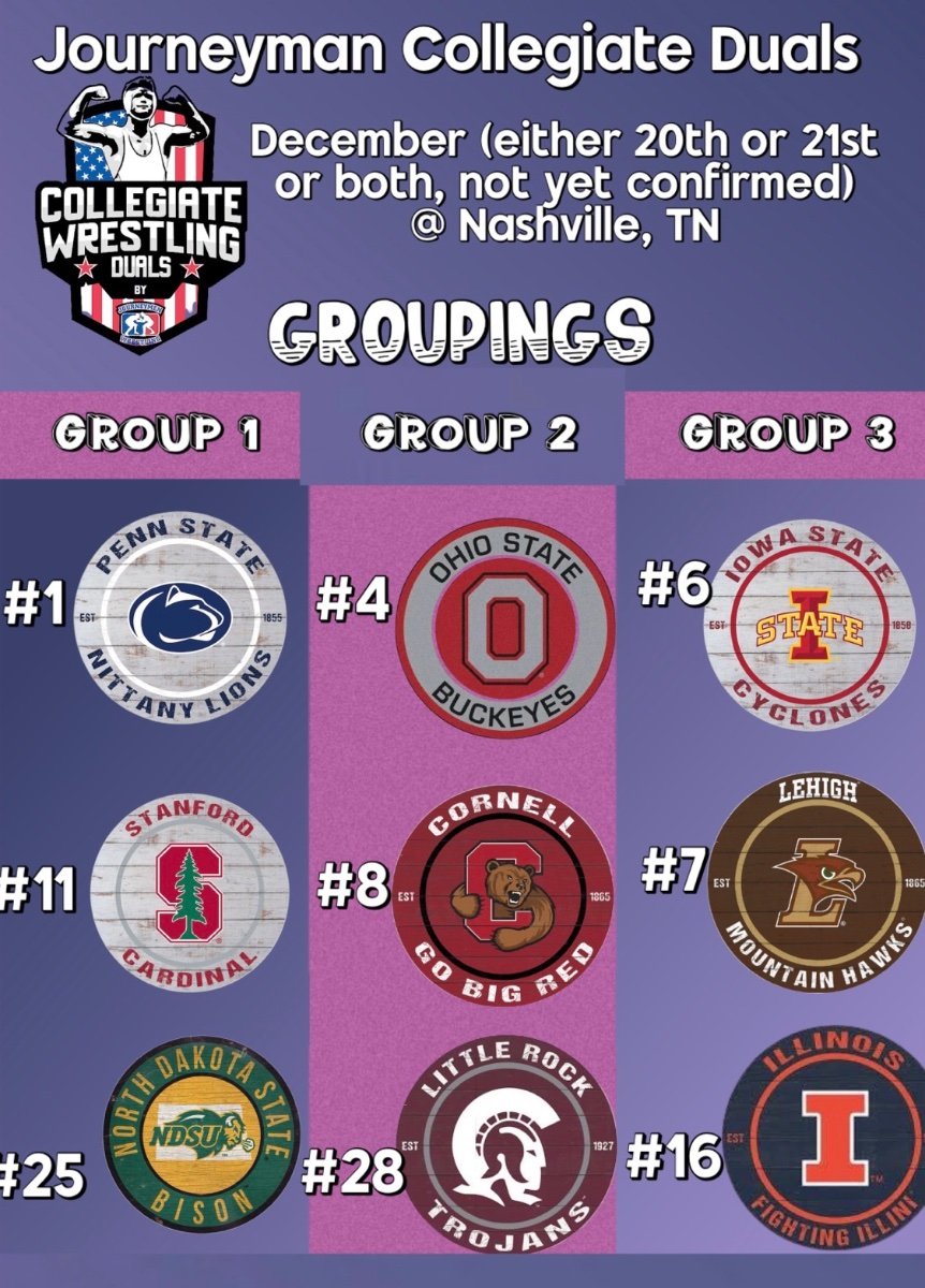 About two months ago I posted the pools for the Journeyman Duals on the weekend of December 20th in Nashville. This not to be confused with the National Dual Invite (the big one that Okla St is hosting. Unfortunately there seems to be 3 different things that are subject to change. One of the three everyone still seems to be quite clueless on. 1- I believe there to be a change in two of the three pools from what I had initially posted. I find this amusing because what It is being changed to is what I originally had thought it could and should be prior to seeing otherwise on teams leaked schedules at the time. Because the National Duals invite has two of the teams that are partaking in the Journeyman duals (Illinois and Little Rock) facing off round 1...this and further evidence has me believing that those two teams have now been placed in separate pools at the Journeyman. When you take that and the original criteria of teams in pools all being in different conferences of each other, and not being on one another's schedule during the year, the pools are: Penn St -Stanford- NDSU this was always the same, all 3 teams confirm this on their schedule. None of the 3 were going to be going to National Dual invite Ohio St- Cornell- Little Rock Ohio St is in and Illinois out lowa St-Illinois -Lehigh Illinois is in and Ohio St out. 2- I was told that despite the event expanding from its previous annual 2 pools of 3 teams to 3 pools of 3 teams, it seems that we will end up seeing less, not more wrestling. I was initially told that at the conclusion of Day 1, there would be a day 2 like there had always been, where teams would compete in their new pools (all 2-0 teams in one, all 1-1 teams in one, and 0-2 teams in one). It seems that teams are looking to wrestle less and there may not be a day 2 any longer. At least not one consisting of new pools. This gateway into segment ... 3- Nobody seems to have a clue on exact date. Is it Saturday Dec 20th, Sunday December 21st or both? Penn St- Stanford -NDSU who are all in one pool show Sat Dec 20th on their schedule. For the 6 remaining teams, only Illinois shows 12/20 on their schedule while the other 5 show Sunday 12/21. Reason this is a big deal to me. and will be to other Cornell fans is because Cornell has 5 guys missing the first semester who will be eligible to wrestle on Sunday, but not on Saturday. (Greg Diakomahalis, Brett Ungar, Vince Cornella, Ethan Fernandez, Meyer Shapiro)). Any athlete not enrolled in the fall semester is eligible to wrestle the day following the last day of the semester. In other words the day after the schools last final. For Cornell that last exam just so happens to fall on Sat Dec 20th. - Today