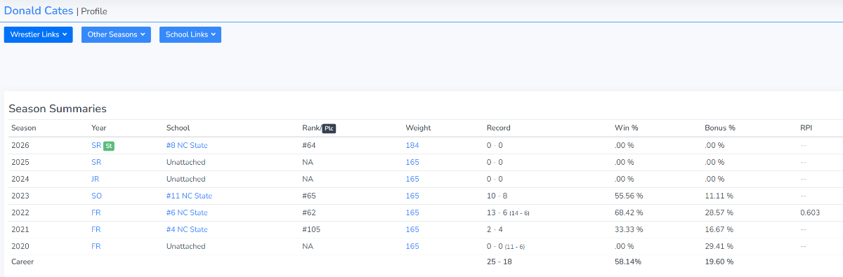 Donald Cates is back after two years away from wrestling and is expected to start 20 lbs heavier than his last weight class.